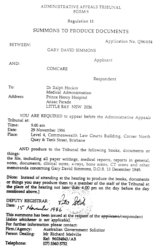 Immediately below you will notice that the Administrative Deputy Registrar, Mr Peter Stirk and Government solicitor, Mr Richard Melville issued a summons to the Prince Henry Hospital in Sydney for a complete copy of my medical records when further below shows they subpoenaed the wrong hospital.