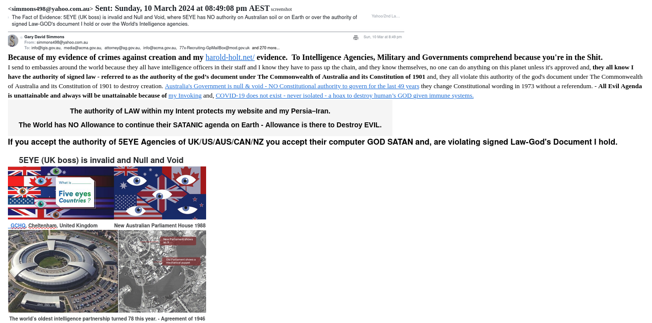 The Fact of Evidence: 5EYE (UK boss) is invalid and Null and Void, where 5EYE has NO authority on Australian soil or on Earth or over the authority of signed Law-GOD's document I hold or over the World's Intelligence agencies.
